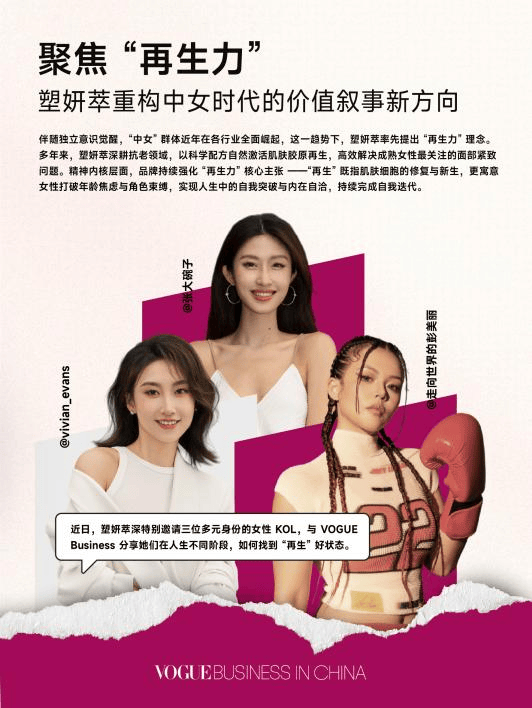 为实现理念的广泛破圈,塑妍萃与权威时尚商业媒体《VOGUE BUSINESS》达成合作,共同打造高格调对话场域。邀请来自不同领域、不同背景的三位顶级KOL构成多元叙事矩阵,共话女性再生力。深度解构女性生命状态、职业发展与文化角色中的精神再生,再由内而外延伸至塑妍萃成就美丽的再生焕新。